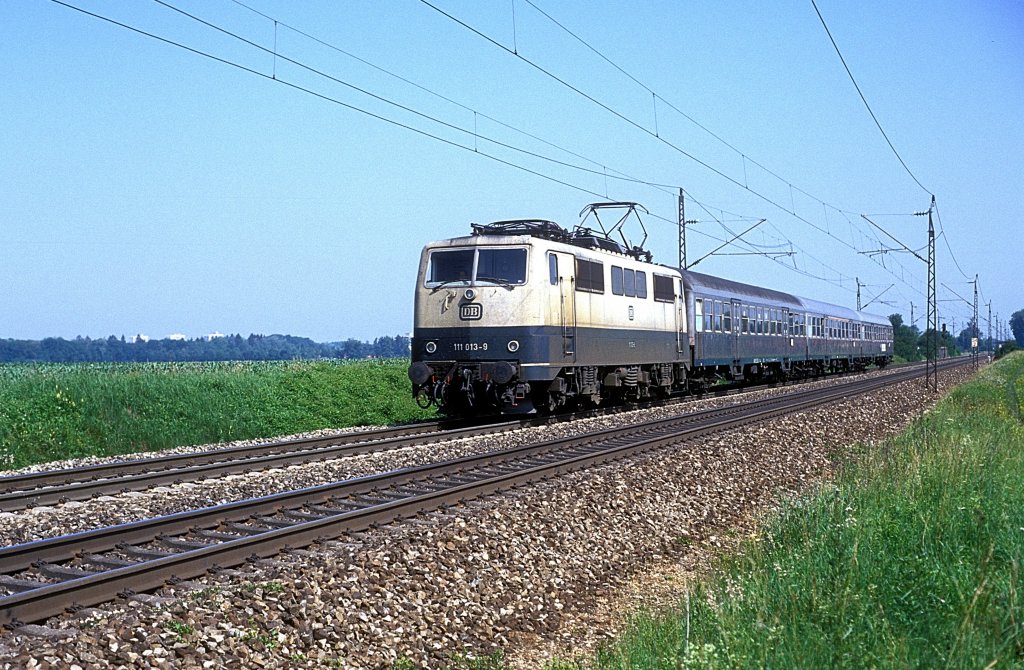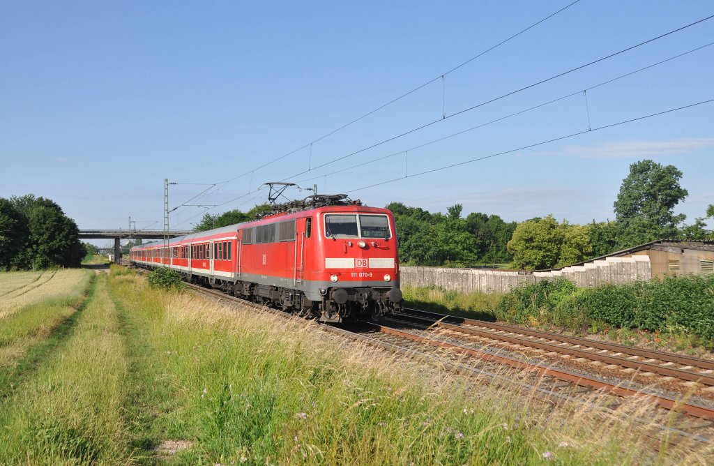 Am 16.06.12 fährt die 111 062-6 mit einer RB von Neuenburg am Rhein nach Freiburg (Breisgau) Hbf in Buggingen ein.