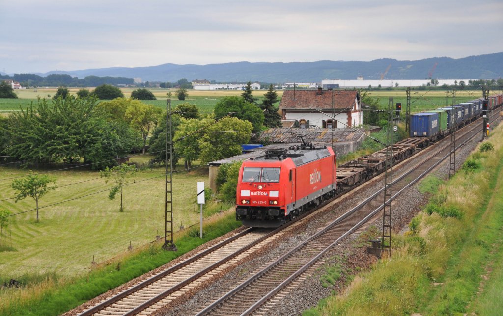 Am 02.04.2012 um 14:16 Uhr fährt 185 354-8 mit einem KLV durch Buggingen.