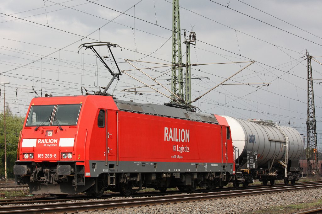 185 288 am 12.4.12 mit einem Kesselwagen bei der Durchfahrt durch Oberhausen-West.