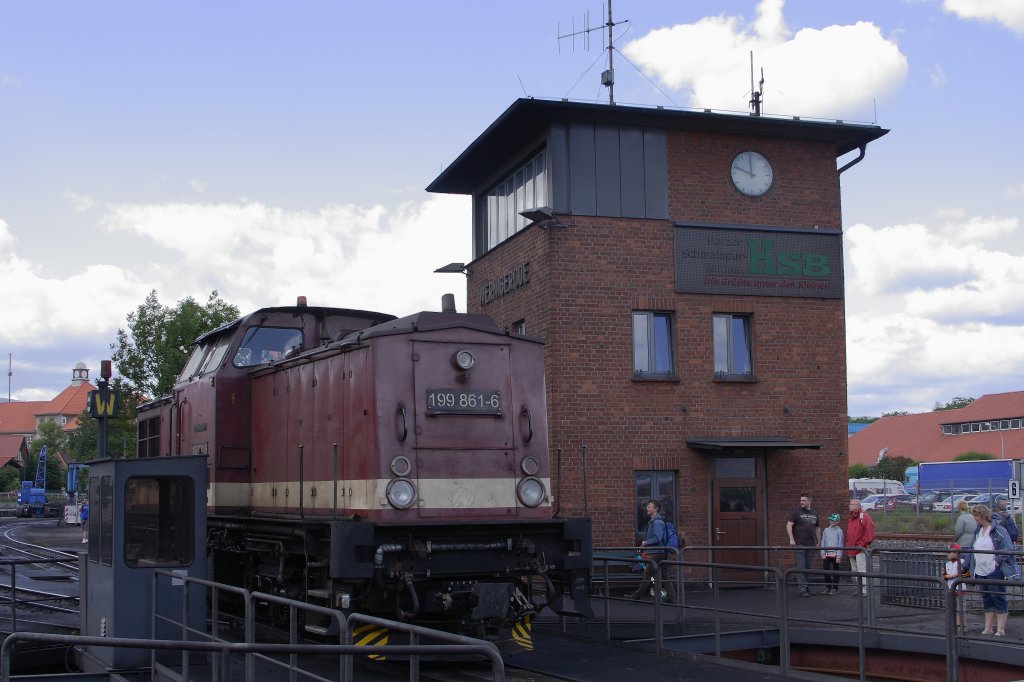 199 861 am 09.06.2012 (Bahnhofsfest!) beim Befahren der Drehscheibe im Bw Wernigerode.