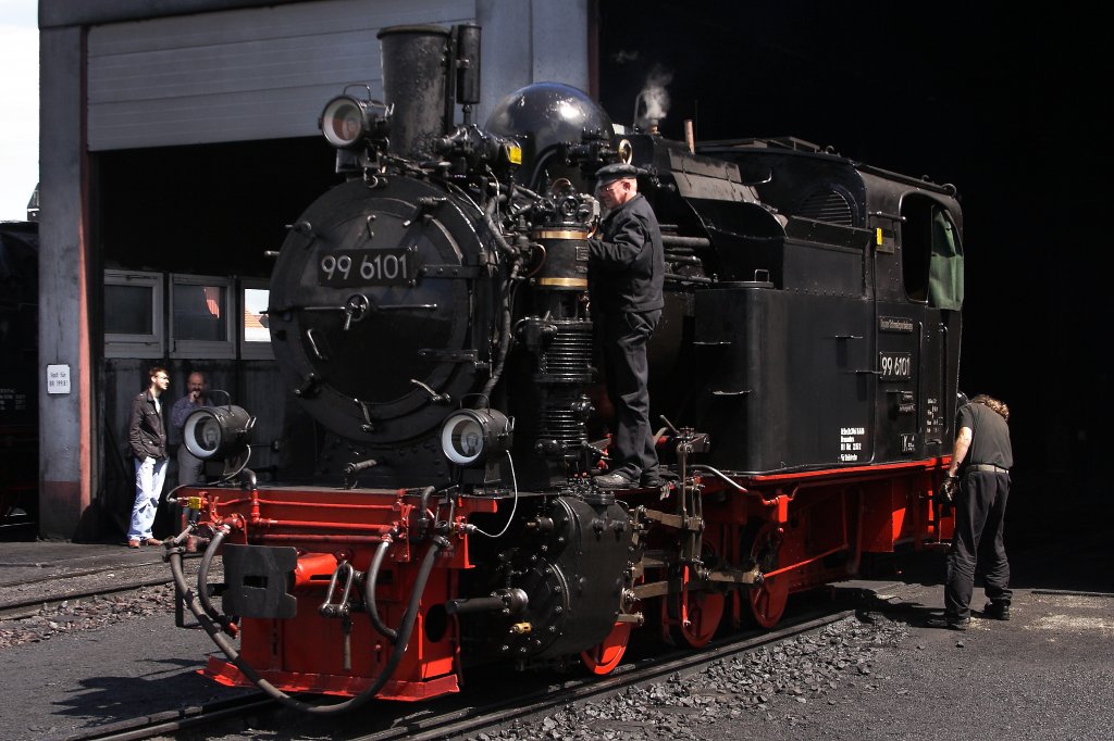 99 6101 am 09.06.2012 im Bw Wernigerode. Bevor sie anläßlich des am heutigen Tag stattfindenden Bahnhofsfestes der HSB einen schweren Foto-Güterzug nach Wernigerode-Hasserode und zurück befördern wird, sind an der historischen Maschine noch so einige fachkundige Handgriffe nötig!