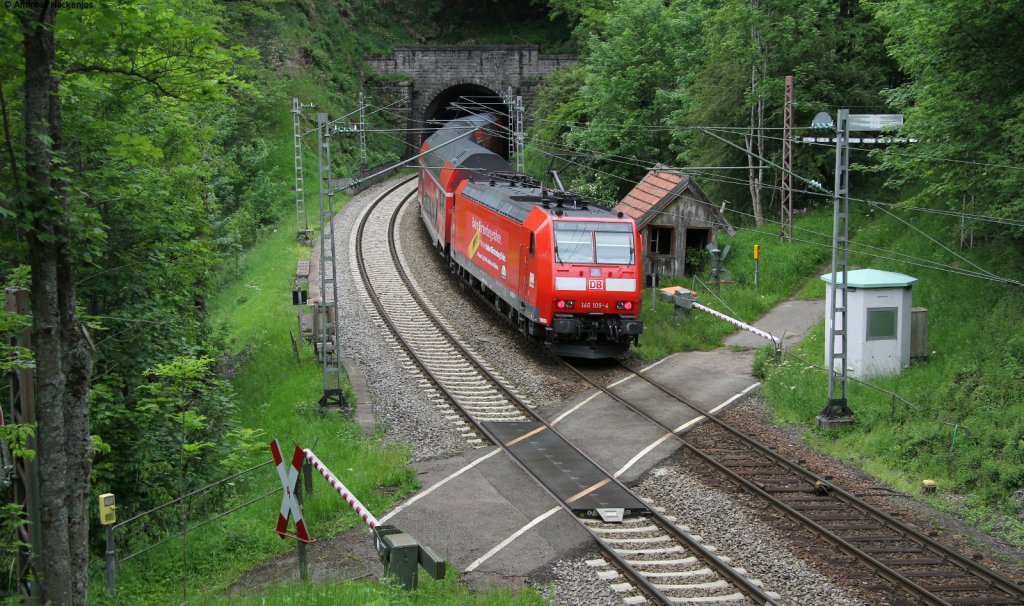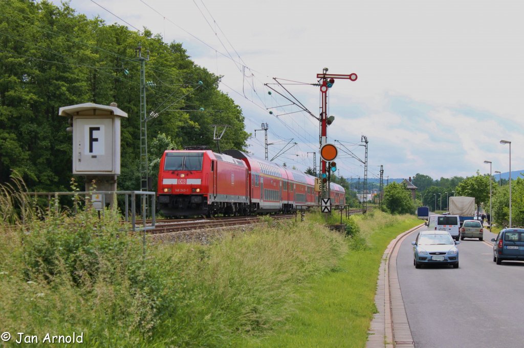 Am 04.06.2012 fuhr 146 243 mit einem Regionalexpress nach Sonneberg am nördlichen Einfahrsignal von Creidlitz vorbei.