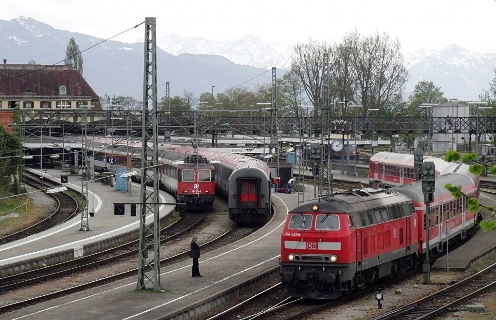 Am 29.04.2012 konnte im Lindauer Bahnhof ein Bild mit drei Zügen gemacht werden, die bei fahrplanmäßigen Verkehr nicht zusammen zu sehen sind. 218 431-5 verlässt mit IRE 4212 nach Ulm den Lindauer Bahnhof, in der Bildmitte die Wagen des verspätet eingetroffenen IC 119 von Münster (Westfalen) nach Innsbruck und links der EuroCity von Zürich, dessen Fahrt auf Grund von Bauarbeiten zwischen Lindau und Hergatz nicht wie vorgesehen in München sondern bereits in Lindau endete.