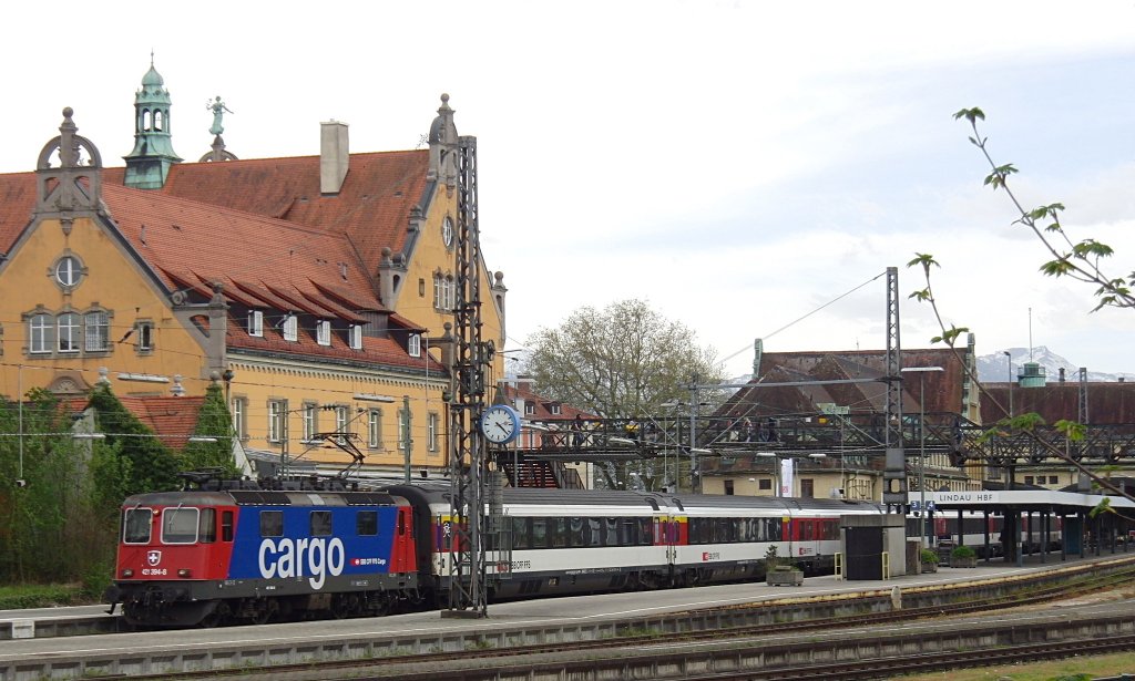 Auf den ersten Blick kein besonders Bild. Wird aber die auf der (funktionierenden) Uhr angezeigte Zeit mit einbezogen, kann festgestellt werden, dass der EuroCity planmäßig bereits eine Stunde Richtung München hätte unterwegs sein sollen. Auf Grund von Bauarbeiten, verbunden mit einer Streckensperrung zwischen Lindau und Hergatz, endete am 29.04.2012 für Re 421 394-8 die Fahrt mit dem EC 195 von Zürich nach München in Lindau, um vier Stunden später die Wagen als EC 192 zurück nach Zürich zu ziehen.
