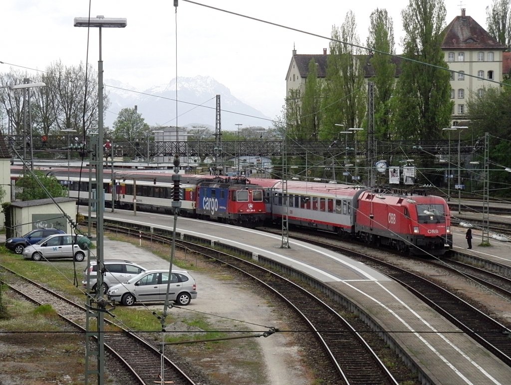 Auf Grund von Bauarbeiten und einer dadurch bedingten Streckensperrung zwischen Lindau und Hergatz konnte am 29.04.2012 im Lindauer Bahnhof der EuroCity von Zürich, dessen Fahrt an diesem Tag in Lindau endete, zusammen mit dem IC 119 von Münster (Westfalen) nach Innsbruck fotografiert werden.