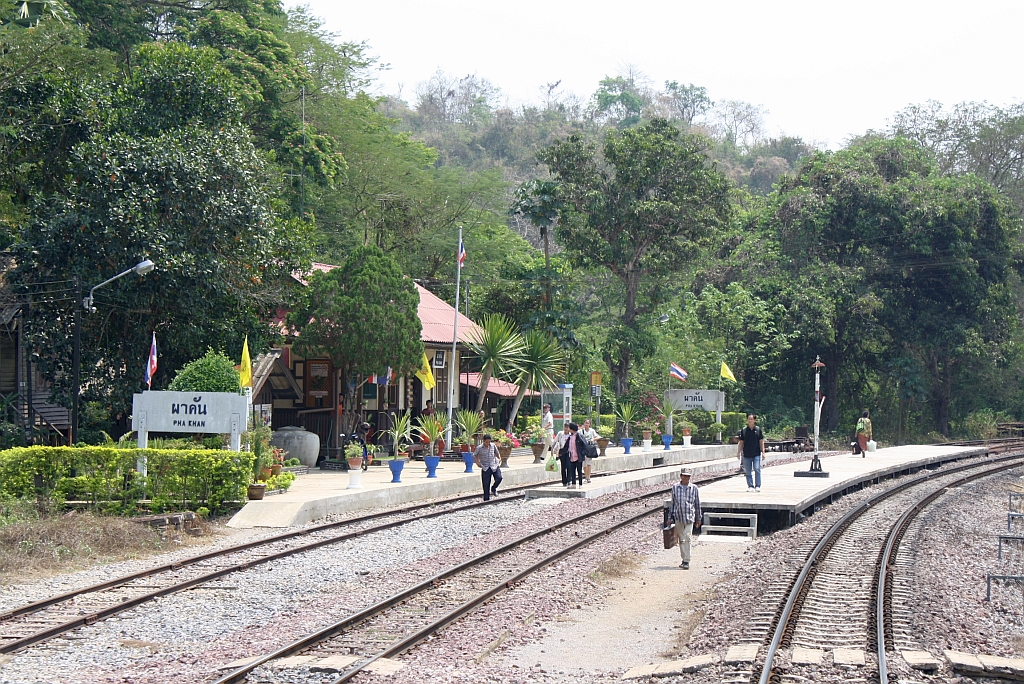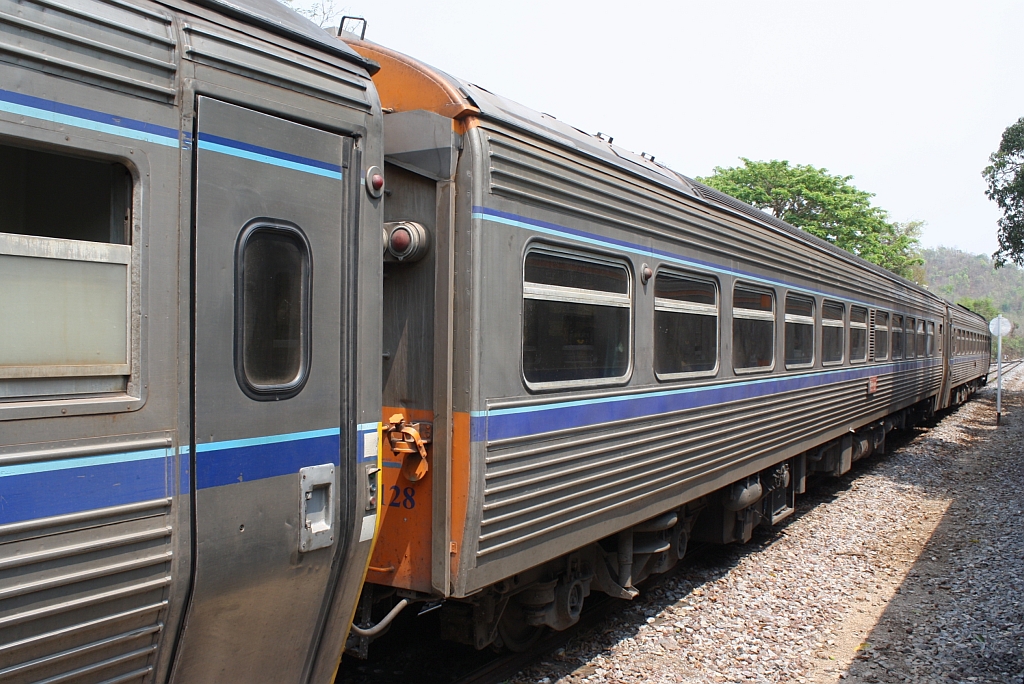Zu den 12 Triebwagen APD.20 (SRT-Nr. 2513 - 2524) wurden von Daewoo Heavy Industries 1995 auch 8 Triebwagen ohne Führerstand (SRT-Nr. 2121-2128) geliefert. - Das Bild zeigt den, im SP EXP DRC 12 von Chiang Mai nach Bangkok eingereihten APN 2128 am 15.März 2012 in der Pang Puai Station.