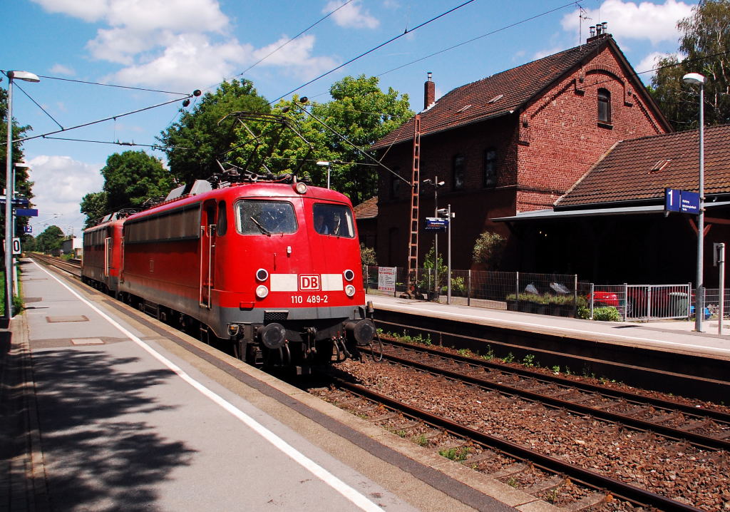 Durch Stommeln kommt am Sonntagnachmittag den 17.6.2012 die 110 489-2 mit der 115 114-1 kalt im Schlepp in Richtung Köln gefahren.