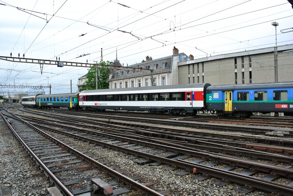 IR 1537 beim Rangieren in Lausanne. Diese Komposition ist speziell formiert: hinter der Zuglok befinden sich 5 B EWII, anschliessend 1 B EWIV, A EWI und ein A EWIV. Der Zug führt nur 2 klimatisierte Wagen, für den Mini-Umlauf (die Komp fährt Neuchatel-Lausanne-Neuchatel) reicht es jedoch, 12.06.2012.