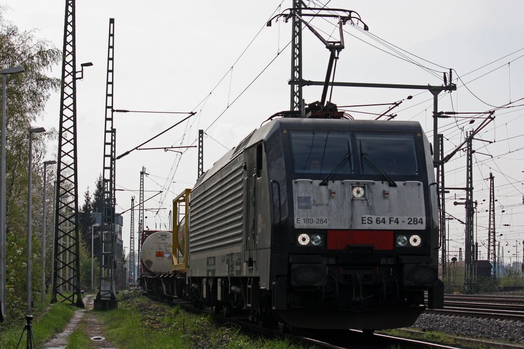 MRCE ES 64 F4-284 (i.E.für Kombiverkehr) am 12.4.12 mit einem Containerzug bei der Durchfahrt durch Oberhausen-West.