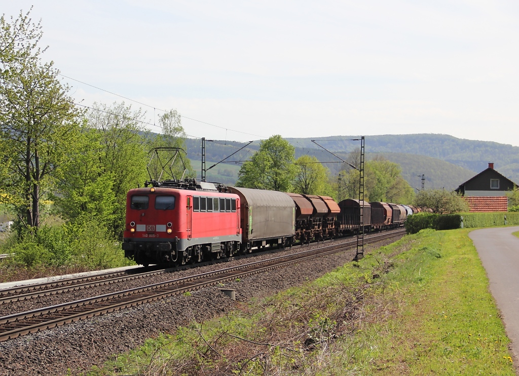 Nachdem den ganzen März und April über schon allerorten viel Grün zurück geschnitten wurde, bot sich bei Ellershausen ein neuer Fotostandort an, den ich mal ausprobieren wollte. Als erstes Testobjekt kam 140 805-3 mit gemischtem Gz in Fahrtrichtung Norden. Aufgenommen am 30.04.2012.