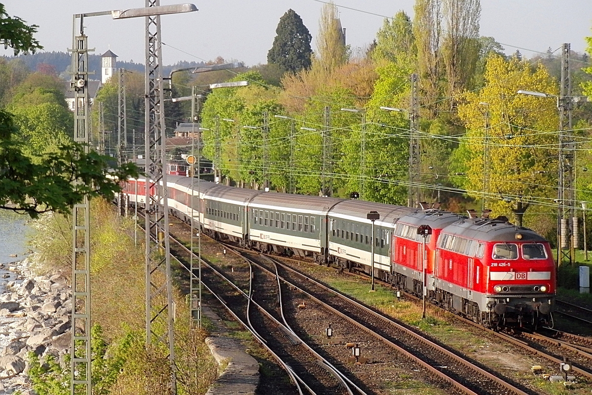 Als in den EuroCity-Zügen zwischen München und Zürich teilweise grün/weiße Wagen eingereiht waren. 218 426-5 und eine weitere 218er ziehen am 17.04.2011 den EC 192 von München kommend über den Bodenseedamm in den Bahnhof von Lindau.