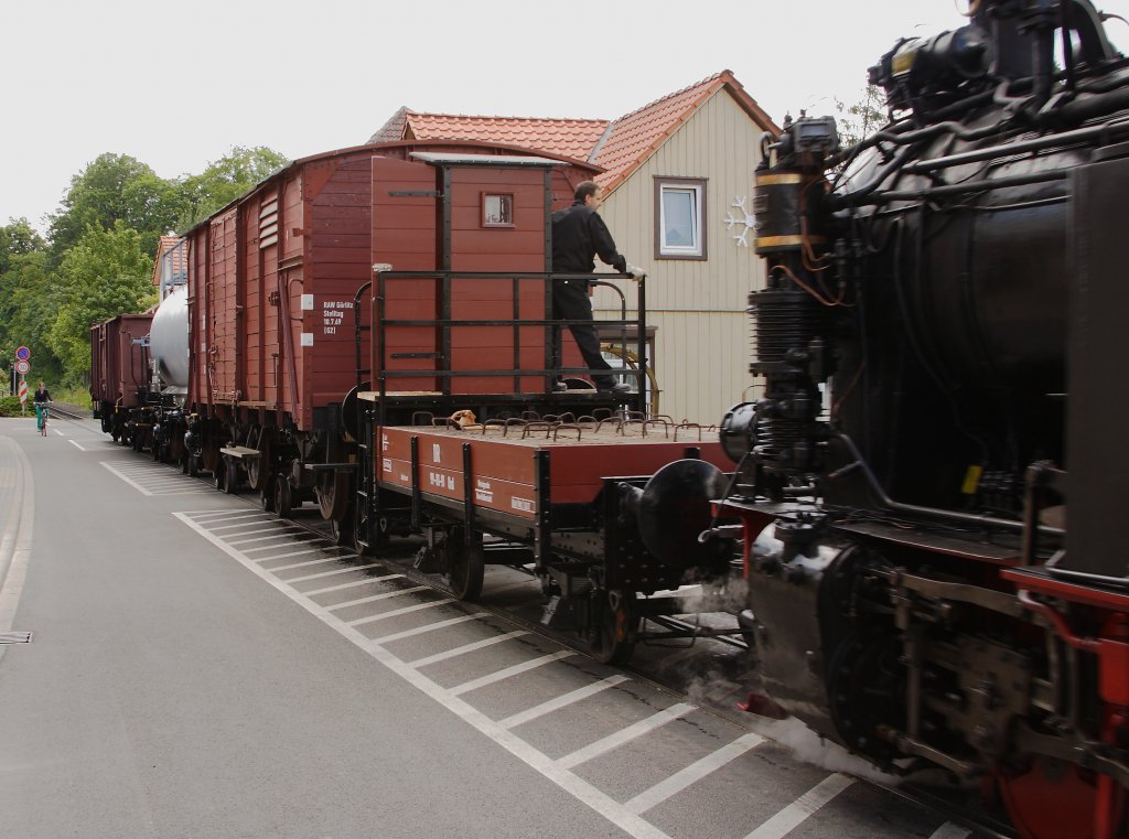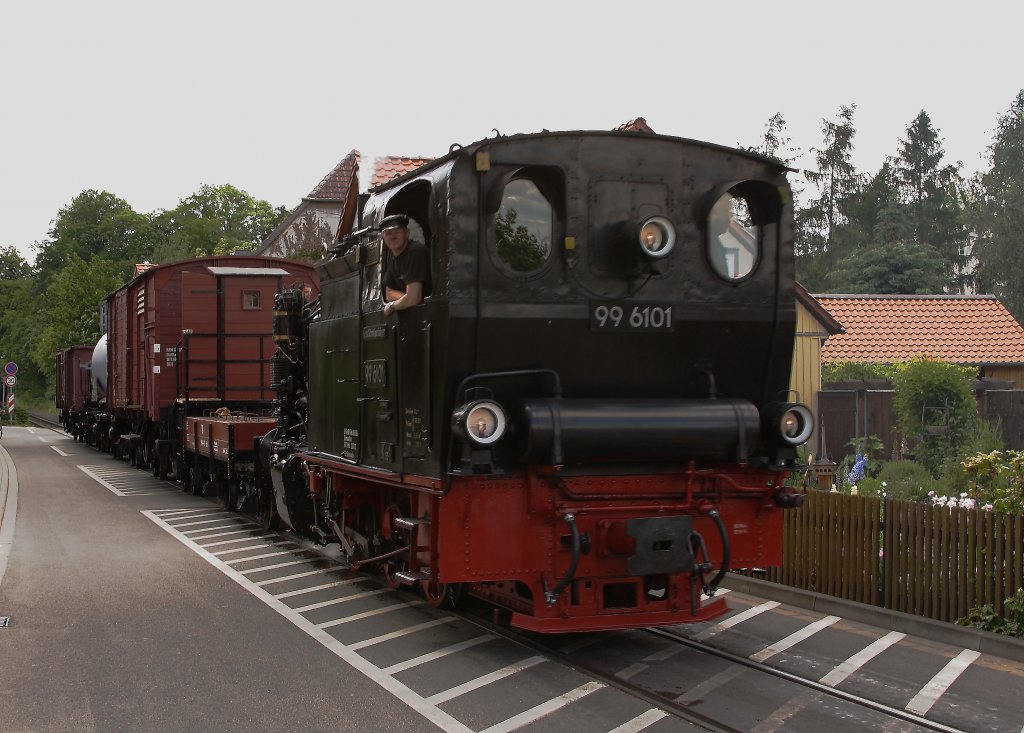 99 6101 während des Bahnhoffestes der HSB am 09.06.2012 mit ihrem Foto-Sondergüterzug in der Wernigeroder Kirchstraße, auf der Rückfahrt von Hasserode.
