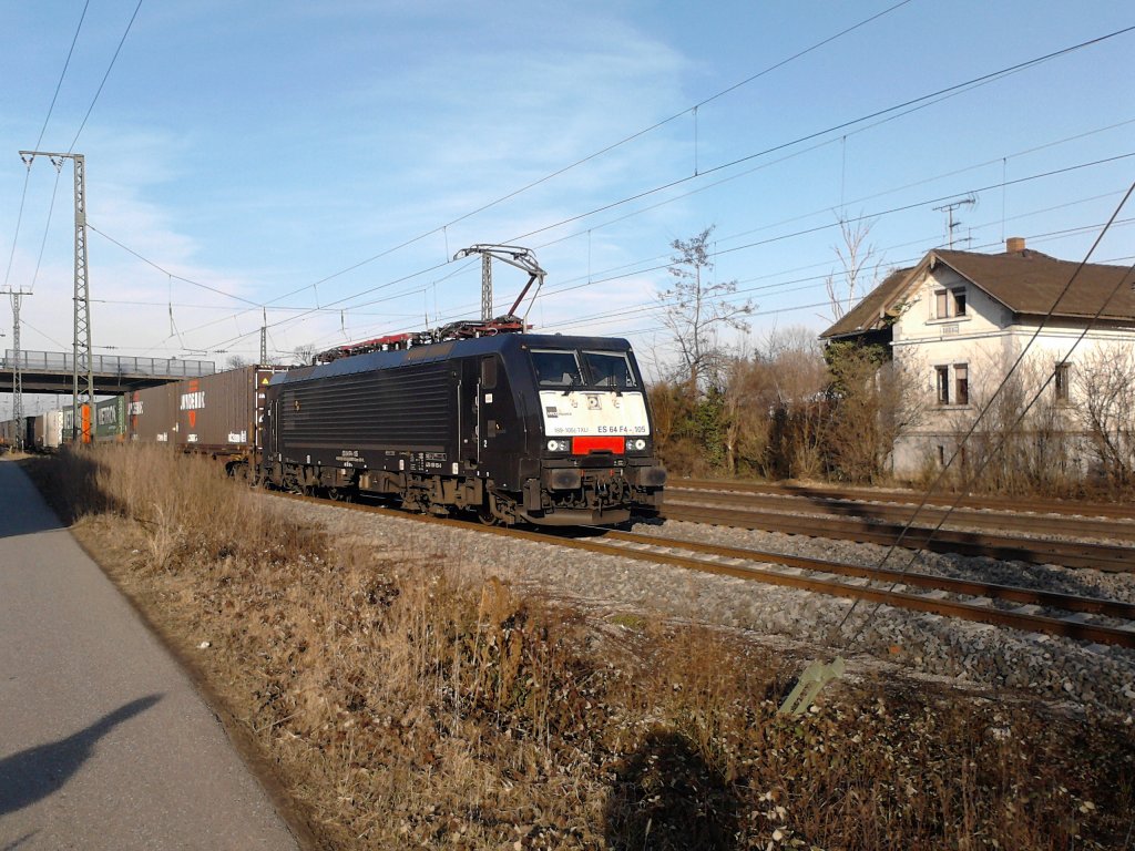 Am 22.02.2012 stand ES 64 F4-105 mit einem KLV in Müllheim (Baden) auf dem Überholgleis.