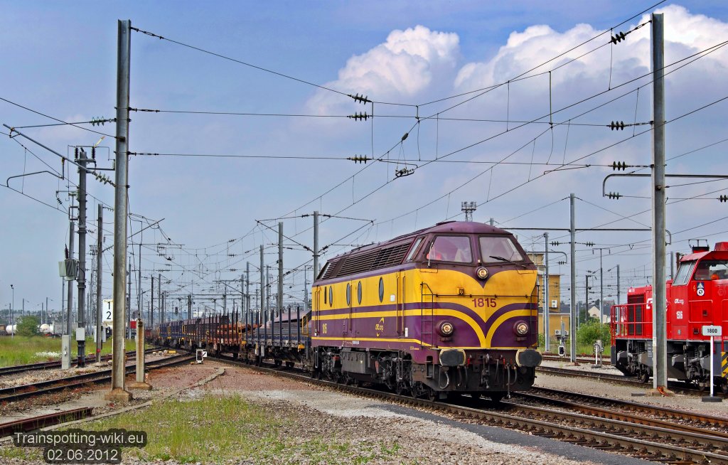 CFL 1815 ist eine von nur noch 3 sich im Dienst befindlichen Loks der BR 1800. Am 2. Juni 2012 ist sie mit einem Zug aus Stahlträgerwagen in Bettembourg angekommen und befördert ihn auf eines der zahlreichen Abstellgleise.