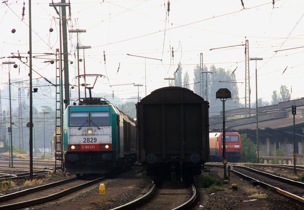 Die Cobra 2829 fährt mit einem kurzen Papierzug aus Köln-Gremberg nach Zeebrugge(B) bei der Ausfahrt von Aachen-West und fährt in Richtung Montzen/Belgien in der Abendsonne am 19.6.2012.