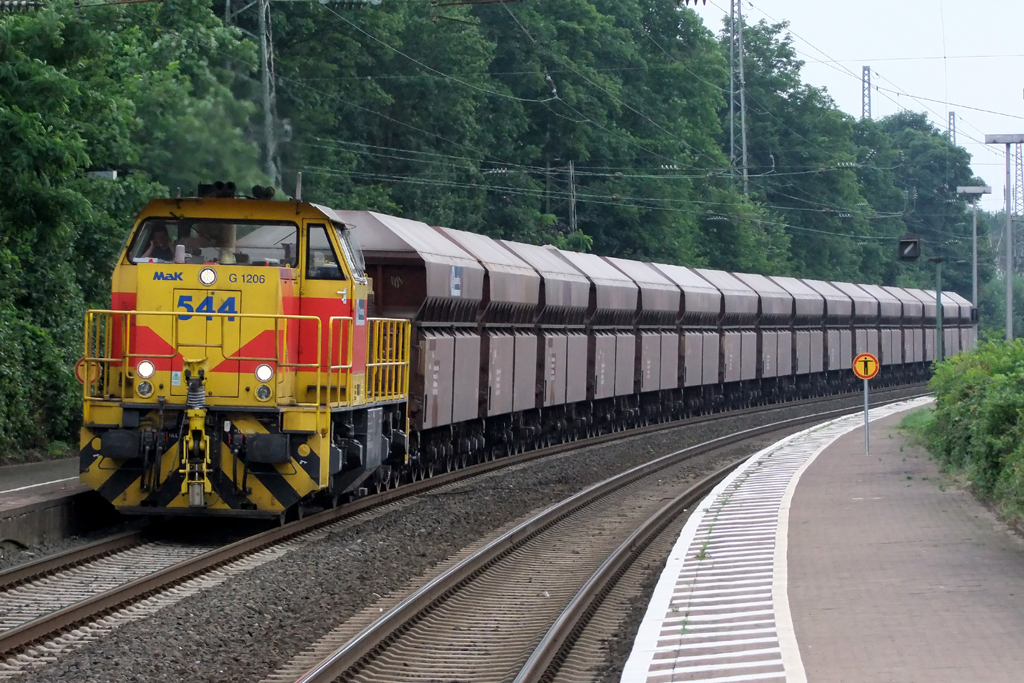 Neusser Eisenbahn MaK G1206 mit einem Güterzug in Düsseldorf-Hamm am 30.05.2012