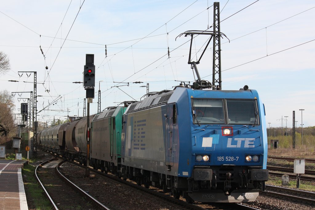 LTE 185 528 "Hermine" zog am 18.4.12 die LTE 185 608 und einen Getreidezug durch Duisburg-Bissingheim.Der Zug war auf dem Weg nach Emmerich.