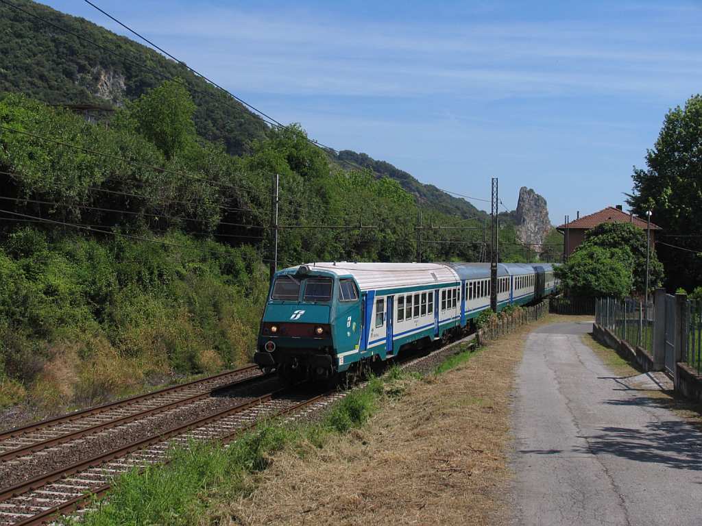 E464.105 mit R 11853 La Spezia Centrale-Pisa Centrale in die Nähe von das ehemalige Bahnhof Montignoso am 14-5-2012.