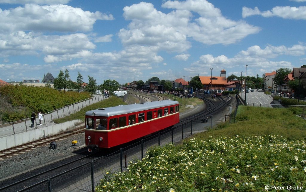 Triebwagen T 102 als Gast von der Selfkantbahn ( Geilenkirchener Kreisbahn ) als Sonderfahrt 89134 aus Wernigerode-Hasserode zur Jubiläumsveranstaltung " 125 Jahre Schmalspurbahnen im Harz ", HSB Harzer Schmalspurbahnen, fotografiert bei der Einfahrt im Bhf. Wernigerode am 09.06.2012 --> der T 102 wurde 1950 von der Waggonfabrik Talbot, Aachen gebaut und war auf der Inselbahn Langeoog im Einsatz --> seit 1999 bei der Selfkantbahn