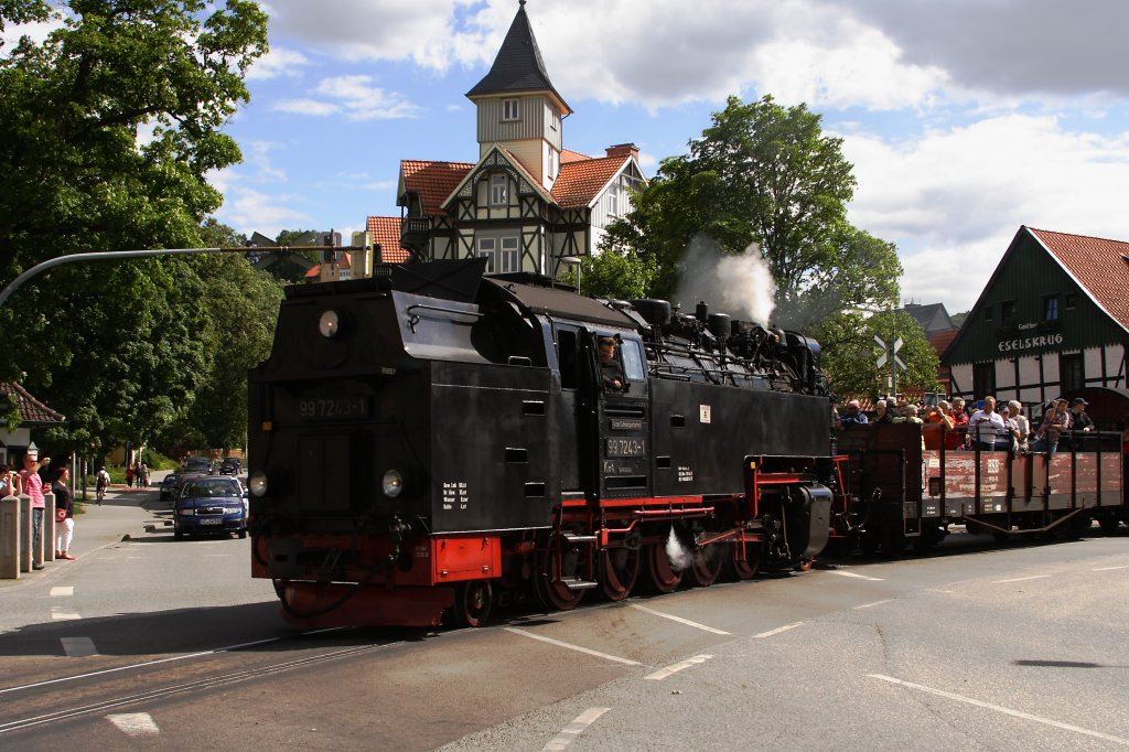99 7243 mit Planzug P8904 von Eisfelder Talmühle am 09.06.2012 beim Überqueren der Westerntorkreuzung in Wernigerode und kurz vor Erreichen des gleichnamigen Bahnhofes.