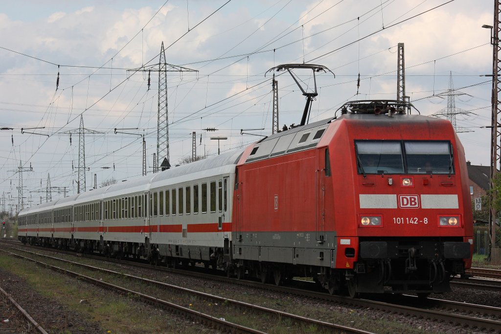 101 142 am 20.4.12 mit einem umgeleiteten IC in Ratingen-Lintorf.