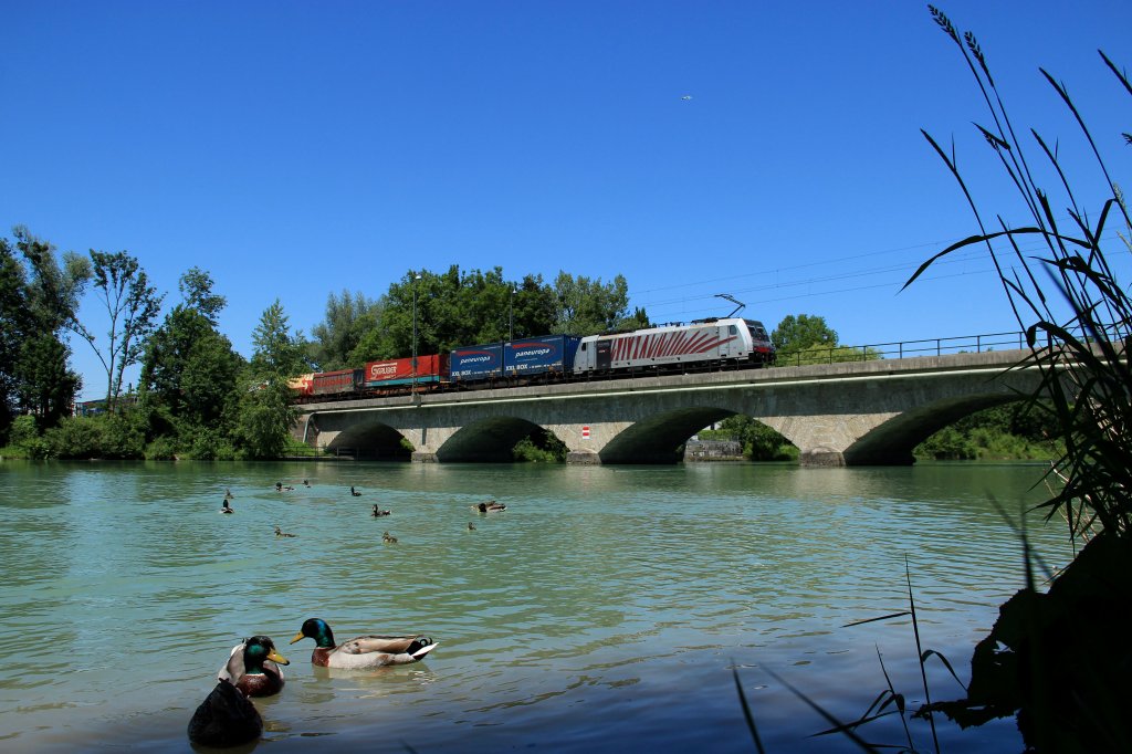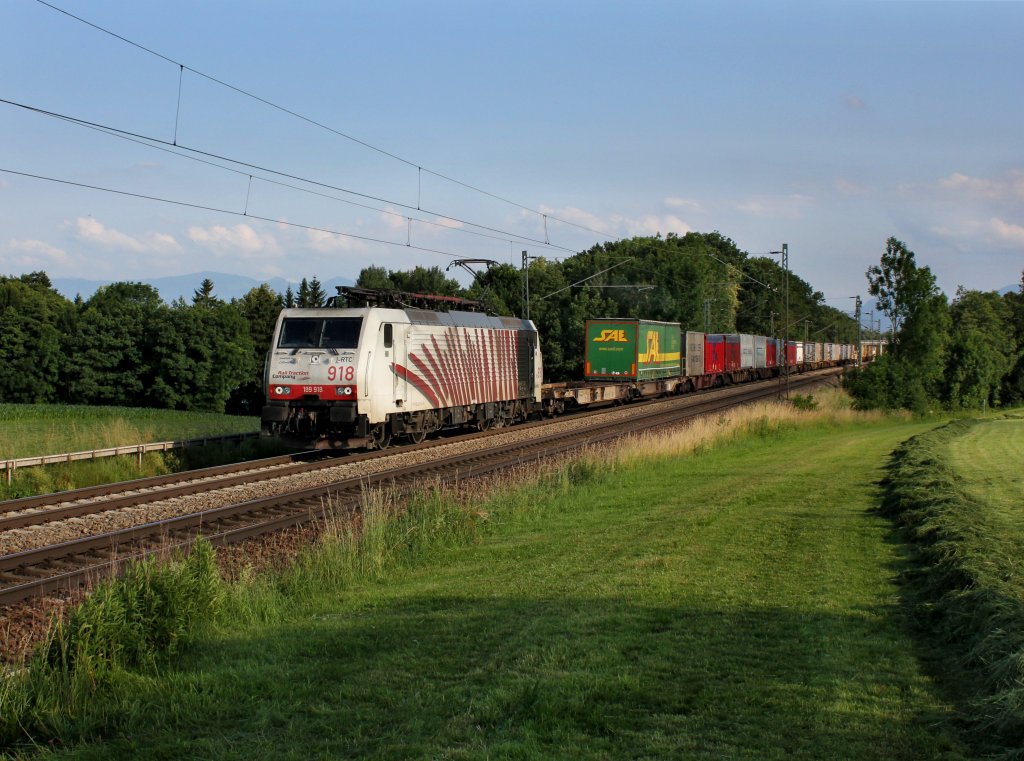 Die 189 918 mit einem KLV-Zug am 23.06.2012 unterwegs bei Hilperting.