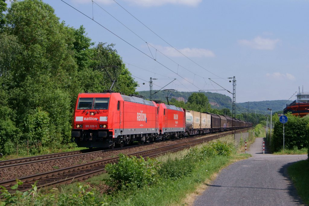 185 225-0 und eine weitere 185 ziehen einen gemischten Güterzug durch Bonn-Limperich am 02.06.2012