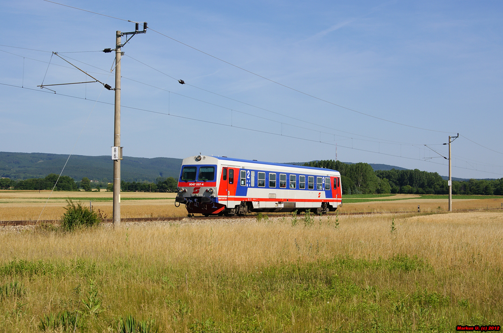 5047 057 war am 24.06.2012 als R7711 von Wiener Neustadt Hbf nach Deutschkreutz unterwegs. Im Hintergrund ist das Ödenburger Gebirge und der Sendemast von Sopron erkennbar.