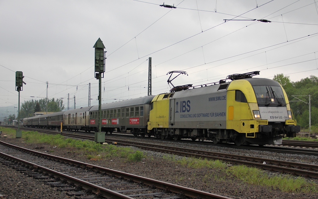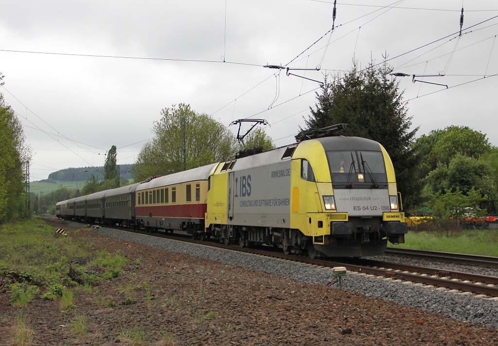 Am 06.05.2012 war 182 596 mit einem Fußballsonderzug von Ingolstadt nach Braunschweig unterwegs und kam auf ihrer Fahrt am frühen Vormittag auch durch Eschwege West. Aufgenommen ist das Bild nahe des BÜ Eltmannshausen/Oberhone.