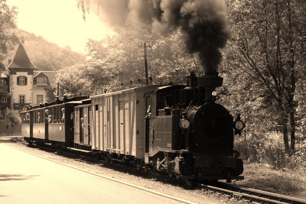 Am 16.06.12 ist I K No. 54 mit einem Sonderzug auf der Lößnitzgrundbahn unterwegs