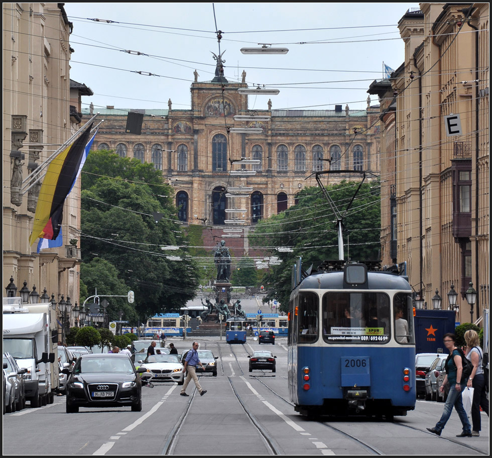 Mit dem Bau der Münchener Maximilianstraße wurde 1853 begonnen, dass Maximilianeum (im Hintergrund) wurde 1874 fertiggestellt, der Straßenbahnwagen vom Typ M, der hinter dem Maxmonument quert, wurde von 1950 bis 1965 gebaut, der Typ P von 1963 bis 1969. Die Personen wurde ebenfalls im letzten Jahrhundert geboren, während die Autos eher aus dem 21.sten Jahrhundert stammen.