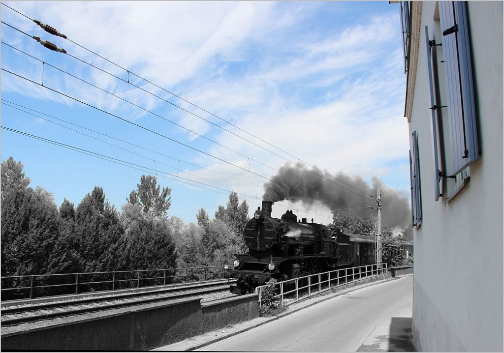 Das sommerliche Grün der Bäume sieht man oft genug - Daher wollte ich die schönen Farben weiß und blau mehr herausstechen lassen. Zur Sonnwendfeier in der Wachau ist die 109 13 von Wien Heiligenstadt nach Spitz/Donau unterwegs und durchfährt hier Greifenstein. 23.6.12