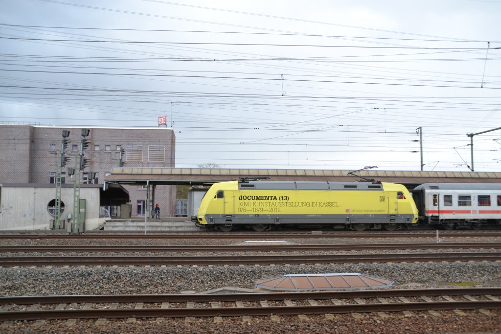 Die wohl auffälligste Werbelok der aktuellen Flotte ist 101 013, hier mit einem IC in Vaihingen (Enz). 20.4.12