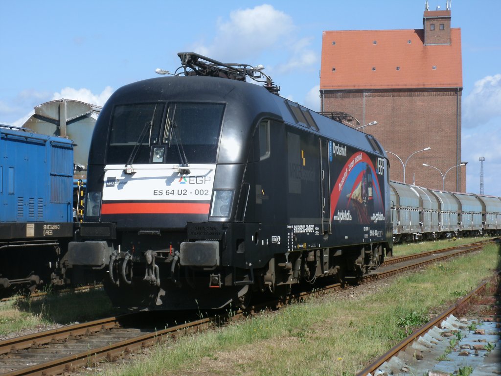 Mittlerweile auch im Stralsunder Nordhafen trifft man den EGP Taurus ES64U2-002 an.Am 17.Juni 2012 fotografierte ich den Taurus durch den Zaun.