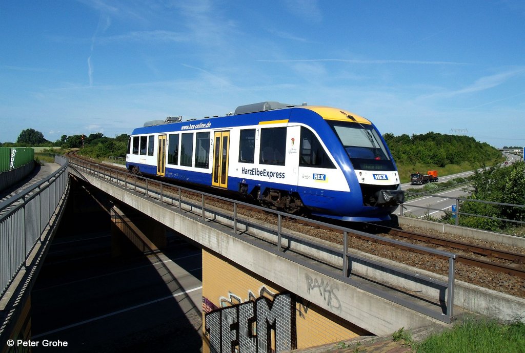 Veolia BR 640 LINT 27 als Harz-Elbe-Express HEX 80861 Halberstadt - Magdeburg, KBS 315 Thale - Magdeburg, fotografiert beim Überqueren der Autobahn A 14 bei Dodendorf am 23.06.2012