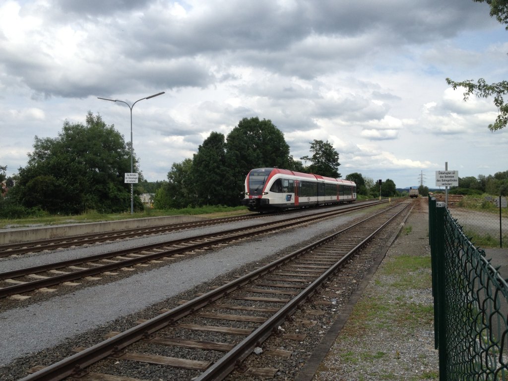 VT 5063.009 als R 8583 am 23.6.2012 bei der Einfahrt in den Bahnhof Deutschlandsberg. An Samstagen kreuzen sich hier zu jeden vollen Stunde die Züge. So auch dieser Zug. Er trifft hier auf R 8570 der heute von VT 5063.002 gefahren wird.