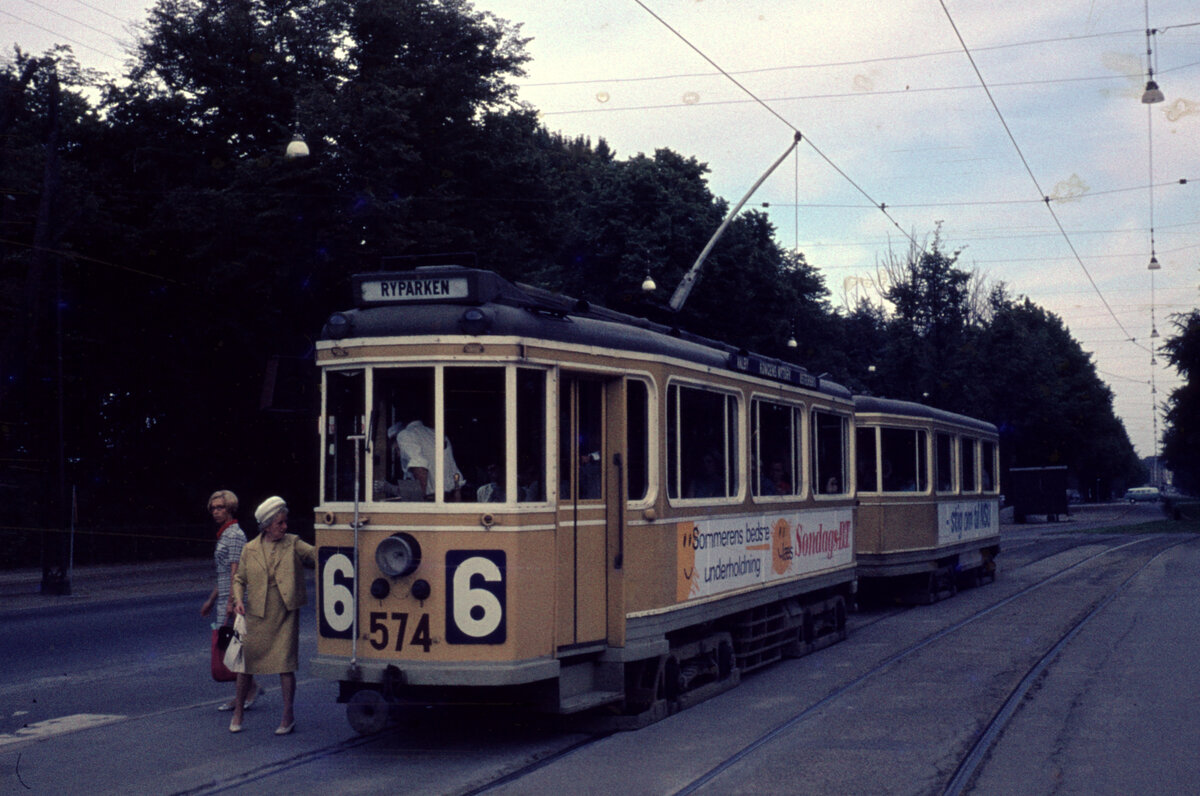 København / Kopenhagen Københavns Sporveje (KS) SL 6 (Großraumtriebwagen 574) København Ø, Østerbro, Øster Allé / Vibenhus Runddel im August 1968. - Scan eines Diapositivs.