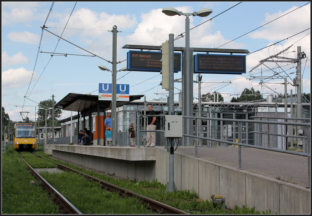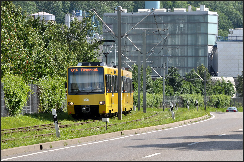 1999 wurde die Linie U14 im Neckartal über Mühlhausen um 4,8 Kilometer bis Remseck-Neckargrönigen verlängert. Hier der lange Streckenabschnitt bei der Großkläranlage zwischen Mühlhausen und Hornbach.