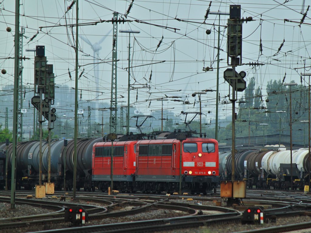 151 075-9 steht am 27.06.2012 mit einer weiteren 151er in Aachen West vor einem langen Kesselzug und wartet auf abfahrt Richtung Köln.