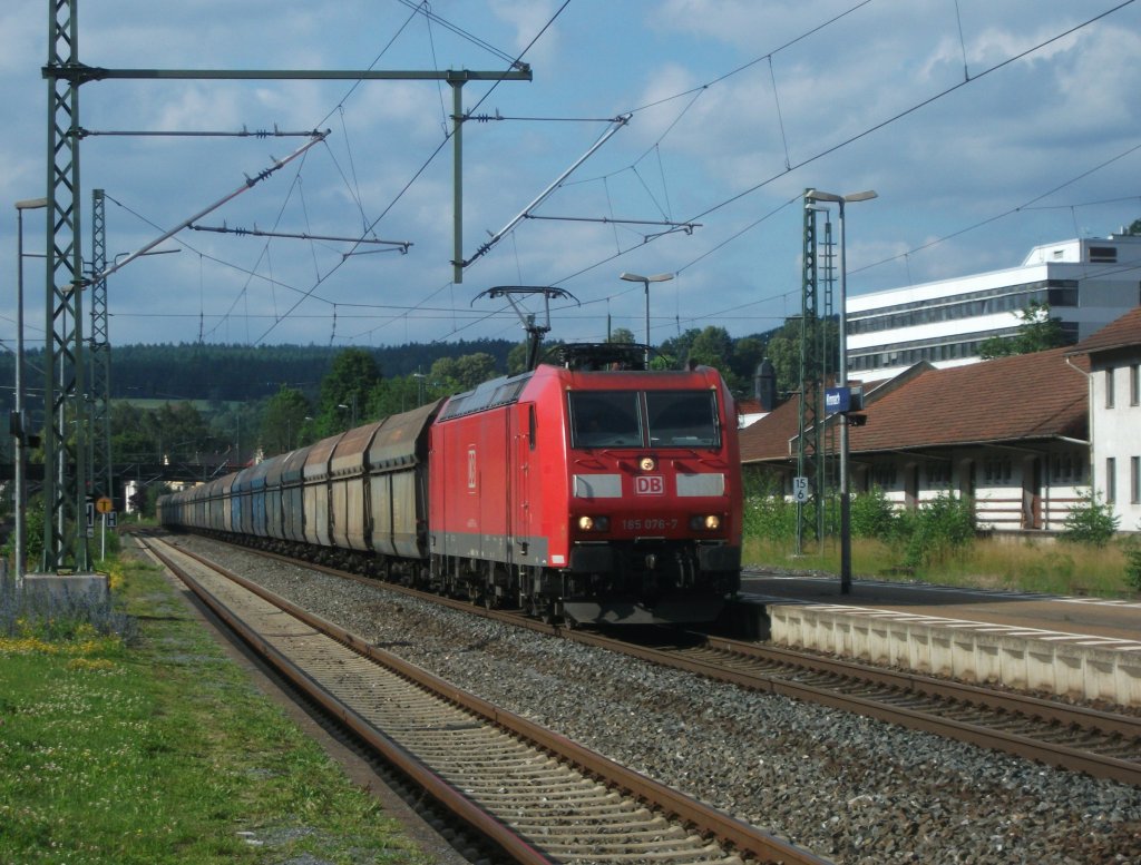 185 076 durchfährt am 26.Juni 2012 mit einem PKP Kohlezug den Bahnhof Kronach Richtung Lichtenfels.