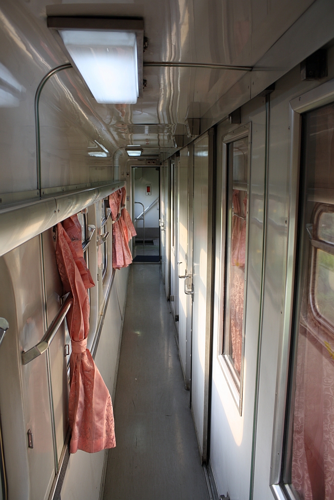 Ansicht des Ganges, wenn man größer als 1,90m ist. บนท.ป.1010 (บนท.ป.=ANF./Air-conditioned First Class Day & Night Coach) am 17.März 2012 kurz vor dem Bf. Lop Buri.