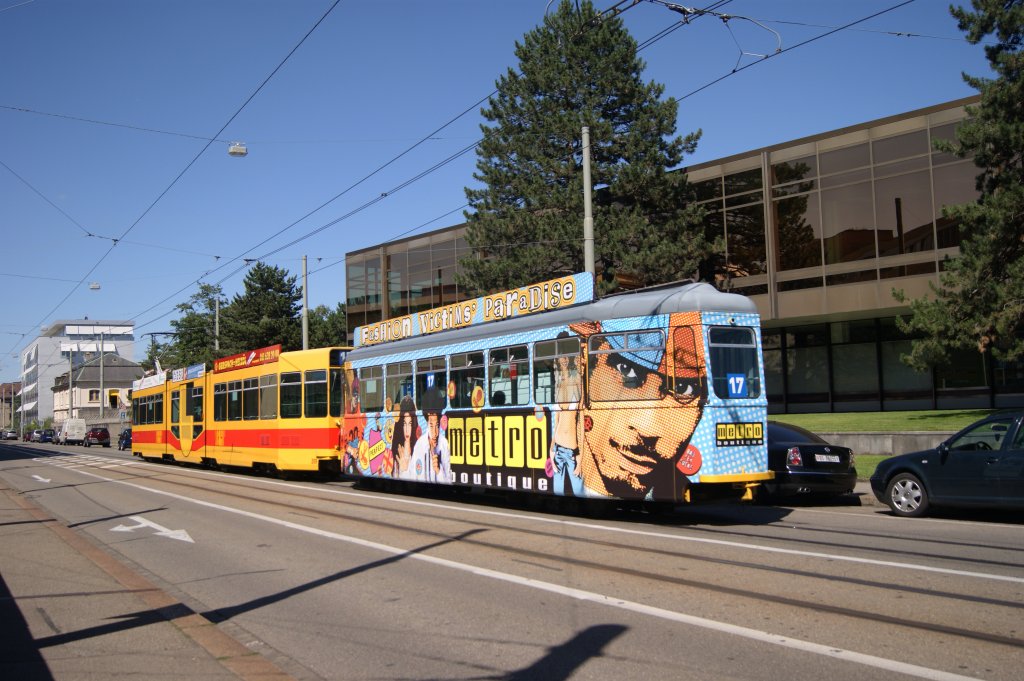 Vollwerbewagen auf der Linie 17 mit dem Be 4/8 240 und der Xundjobs.ch Werbung und dem B4 1418 mit der Vollwerbung für das U-Abo. Die Aufnahme stammt vom 27.06.2012.