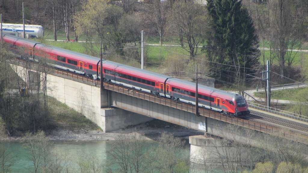 Der RJ 165 auf der Innbrücke bei Brixlegg am 10.4.2012.