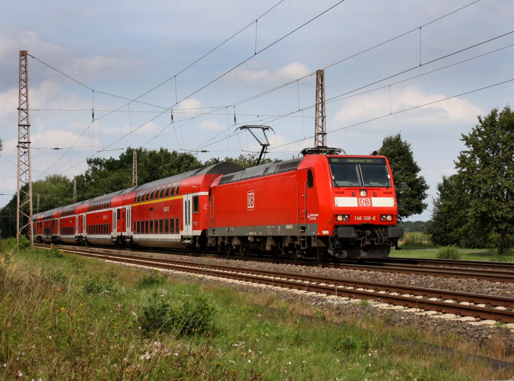 Die 146 108 mit einem RE nach Hannover am 11.08.2010 unterwegs bei Dörverden.