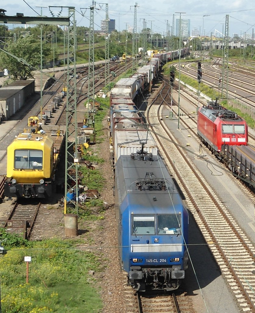 Farbvielfalt im Mannheimer Rbf. Links ein gelbes Wartungsfahrzeug, in der Mitte ein einfahrender Güterzug mit 145-CL 204 in blau und eine verkehrsrote 185, die auf die Abfahrtsfreigabe wartet. (06.09.2011)