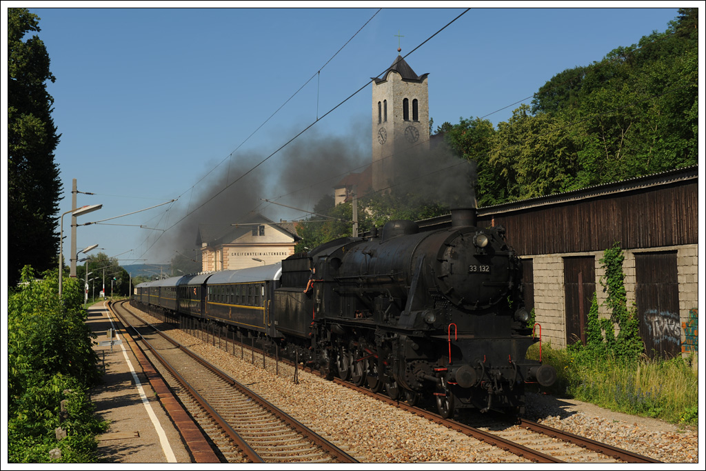 Sicher die abgelutschteste, aber schönste Stelle auf der unteren FJB - Greifenstein-Altenberg. 33.132 auf dem Weg zur Sonnwendfeier in der Wachau mit ihrem Sonderzug SR 17164 (ab Krems als R 17144) von Wien Heiligenstadt nach Spitz an der Donau bei der Durchfahrt in Greifenstein-Altenberg.