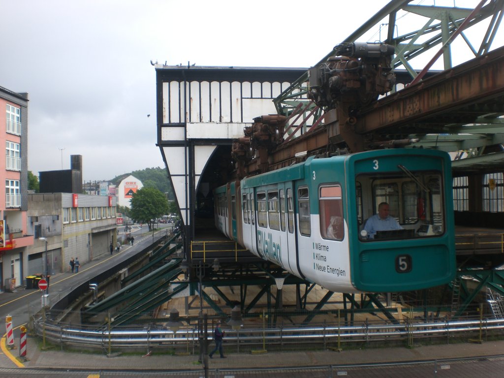 Wuppertaler Schwebebahn in Richtung Vohwinkel am Haltepunkt Oberbarmen Bahnhof.(27.6.2012)