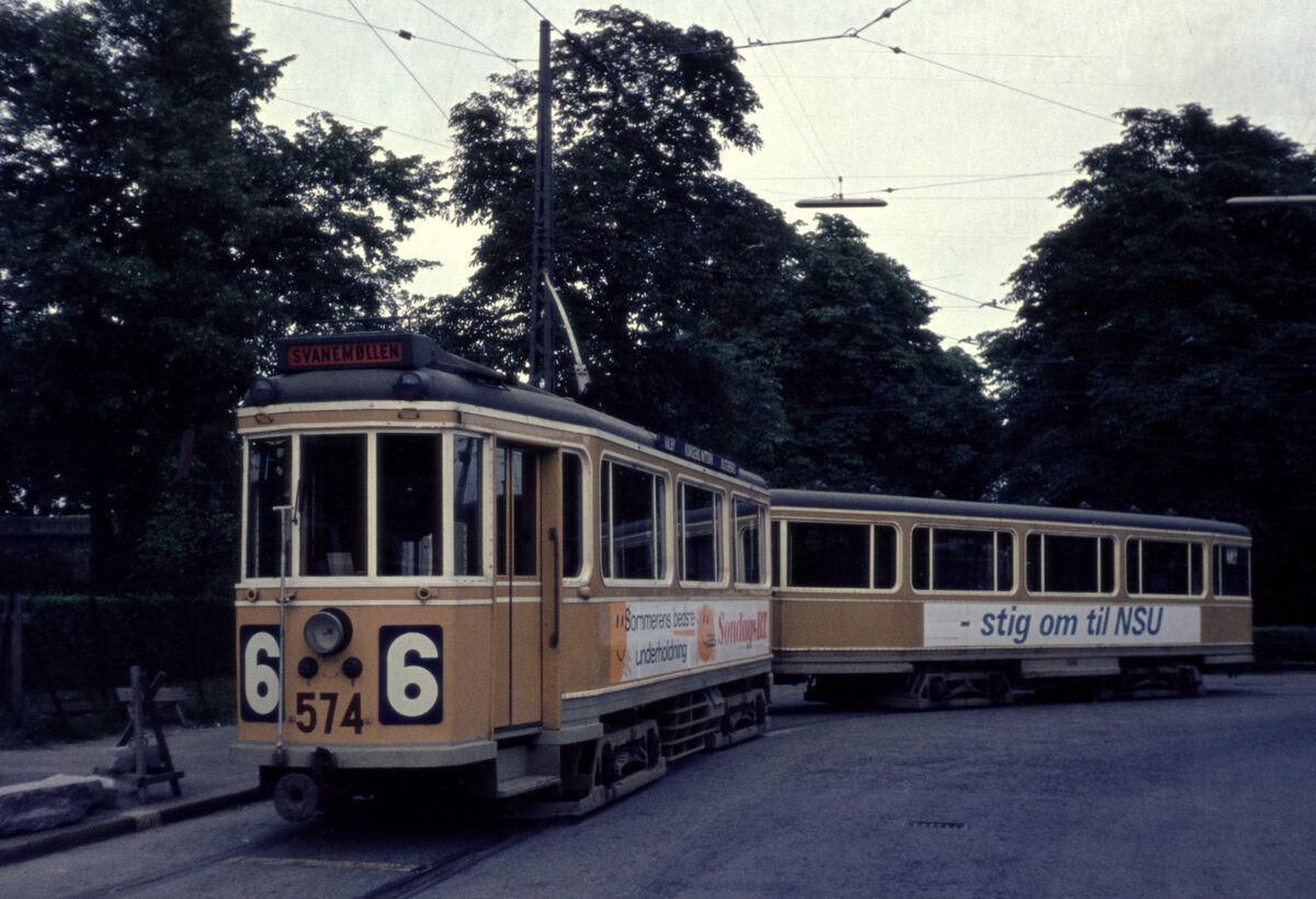 København / Kopenhagen Københavns Sporveje (KS) SL 6 (Großraumtriebwagen 574) København Ø, Østerbro, Ved Sporsløjfen (: An der Gleisschleife) im August 1968. - Nachdem der Schaffner den Stromabnehmer gewendet hat, wird der Zug von der Schleife rückwärts in den Betriebsbahnhof Svanemøllen, der sich rechts außerhalb des Fotos befindet, fahren. - Scan eines Diapositivs.
