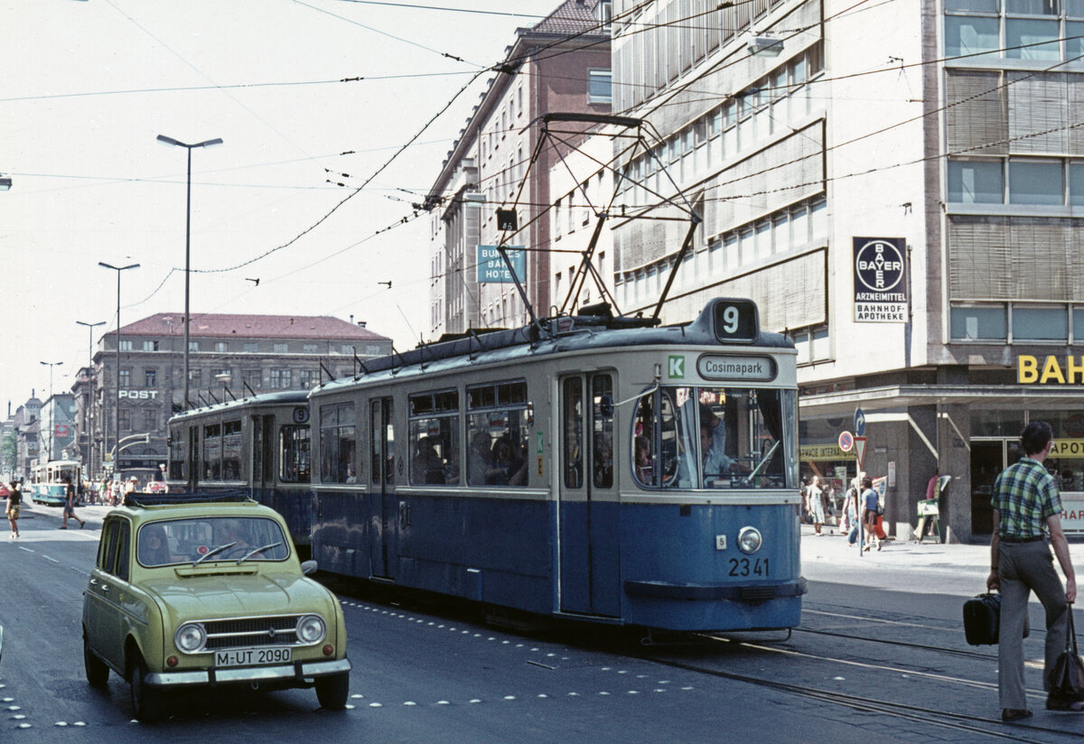 München MVV Tramlinie 9 (M3.64 2341) Bayerstraße / Hauptbahnhof am 17. August 1974. - Scan eines Diapositivs.