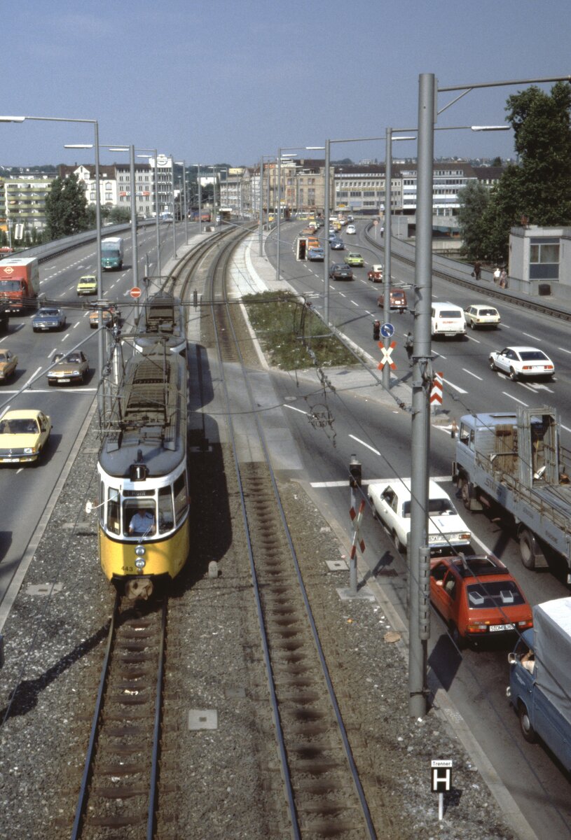 Stuttgart SSB SL 1 (Maschinenfabrik Esslingen-GT4 443) im Juli 1979: Der Zug ist eben über die König-Karls-Brücke gefahren und nähert sich der Haltestelle Mineralbäder. - Scan eines Diapositivs. Film: Kodak Ektachrome. Kamera: Leica CL.